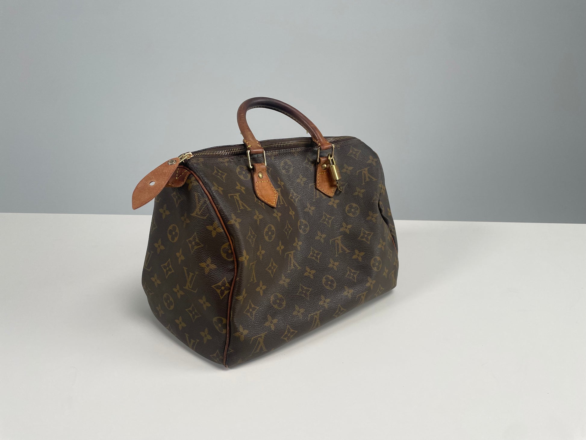 This Louis Vuitton Speedy 30 is a monogram handbag bag with golden hardware. The condition of the bag is 'good' with a few signs of wear. The zipper slider of this bag has been replaced.The date code is 'TH1001' and the dimensions are 30 x 21 x 17.